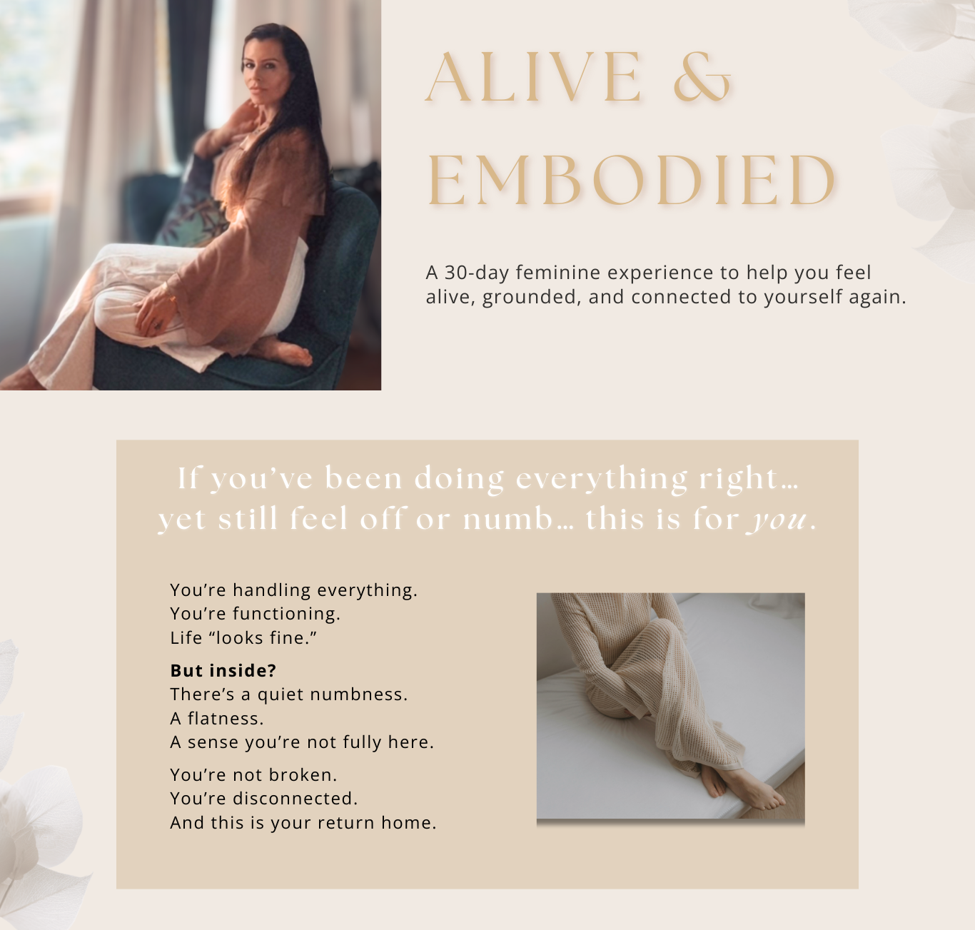 Alive & Embodied is a soft, feminine 30-day journey that helps you shift out of numbness, reconnect to your body, and feel alive, grounded, and emotionally present again — in just minutes a day.